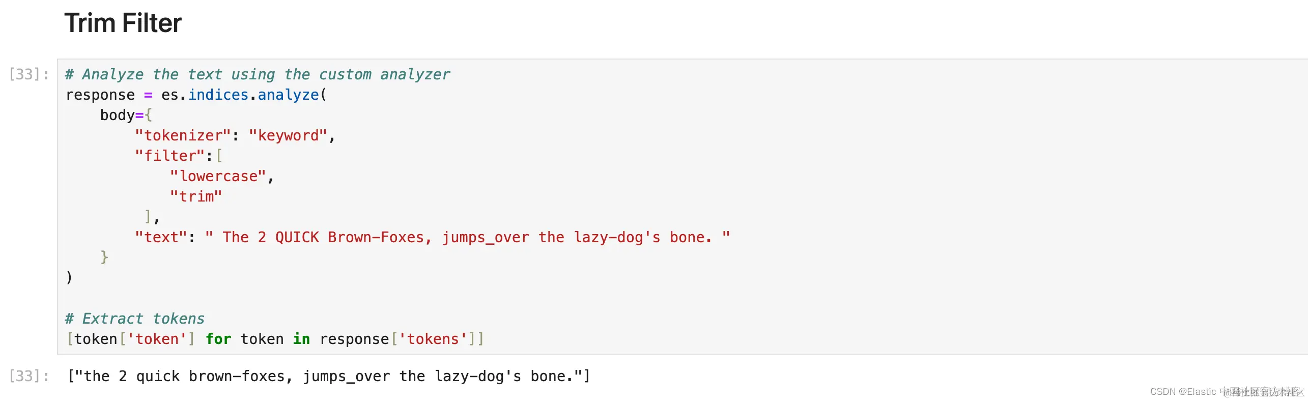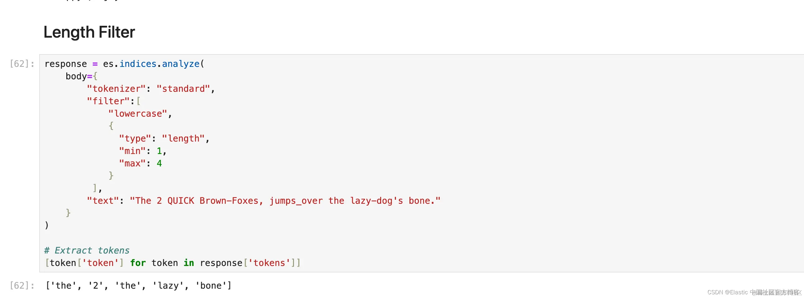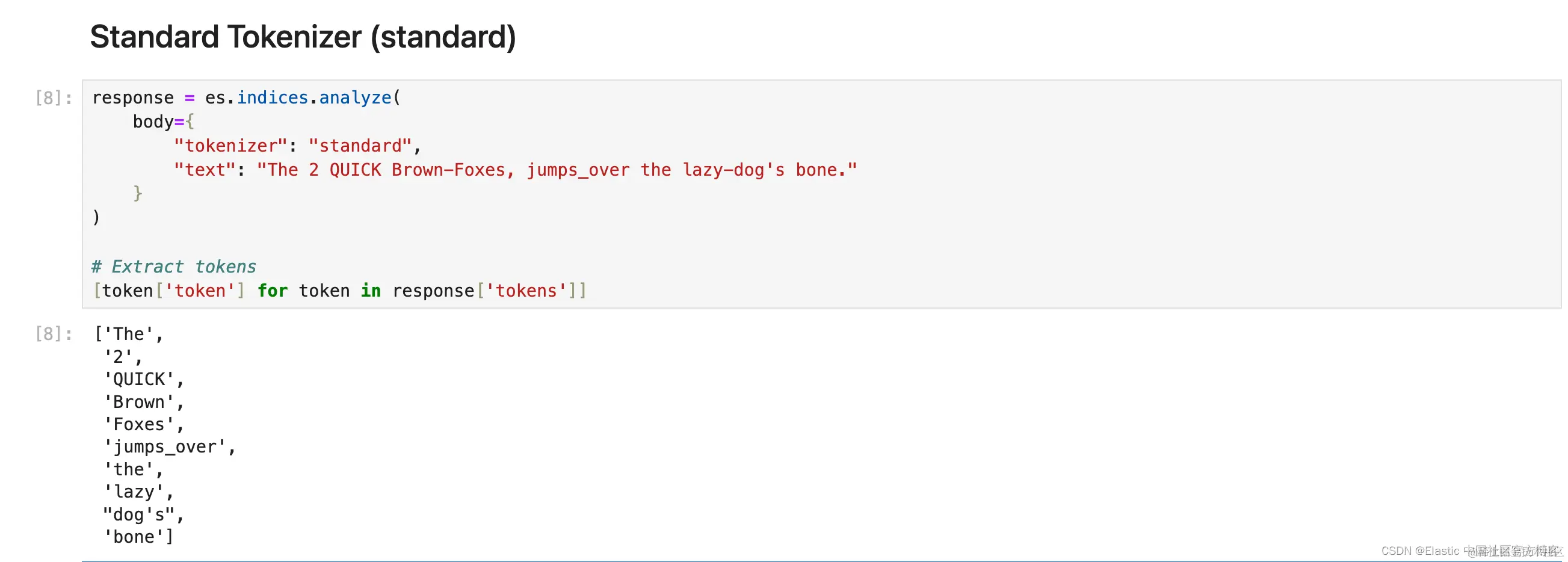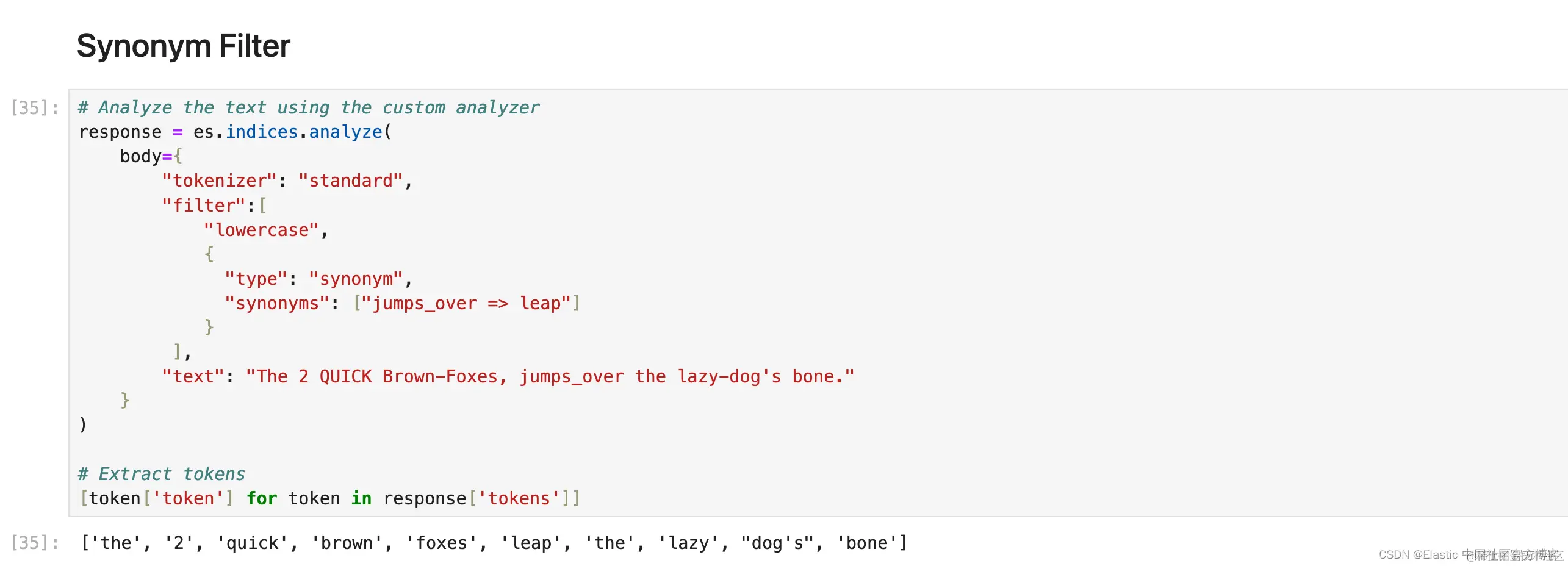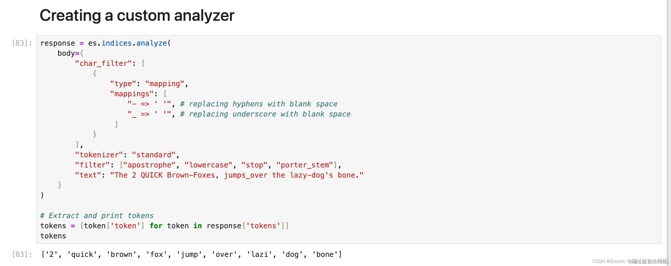 1. response = es.indices.analyze(