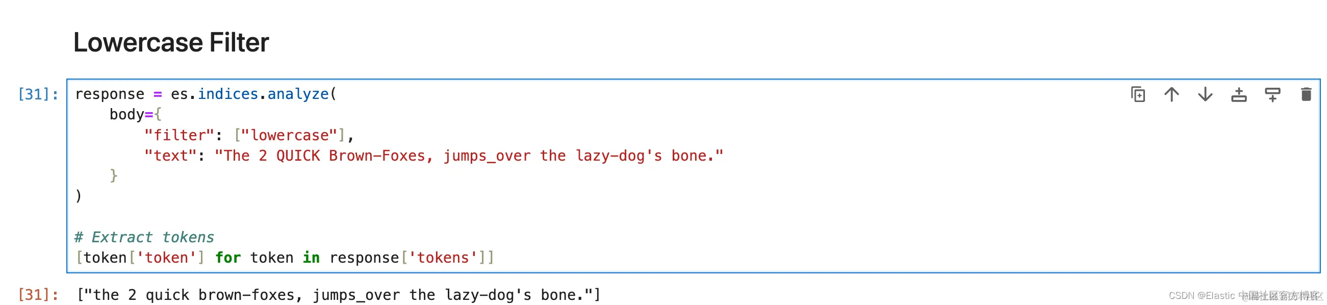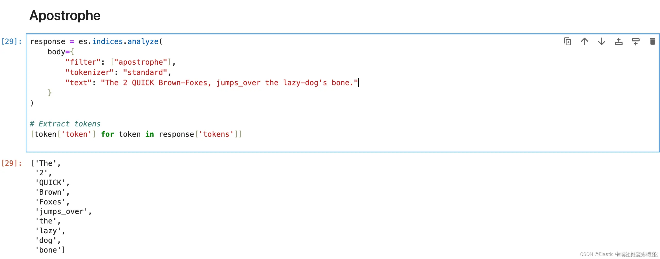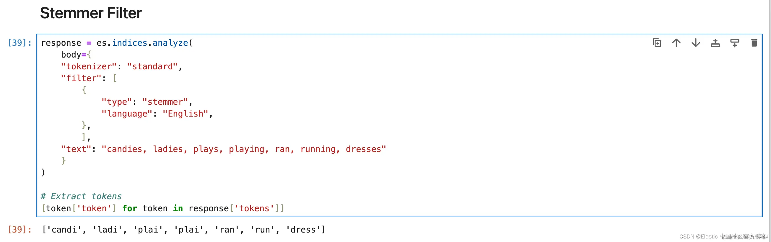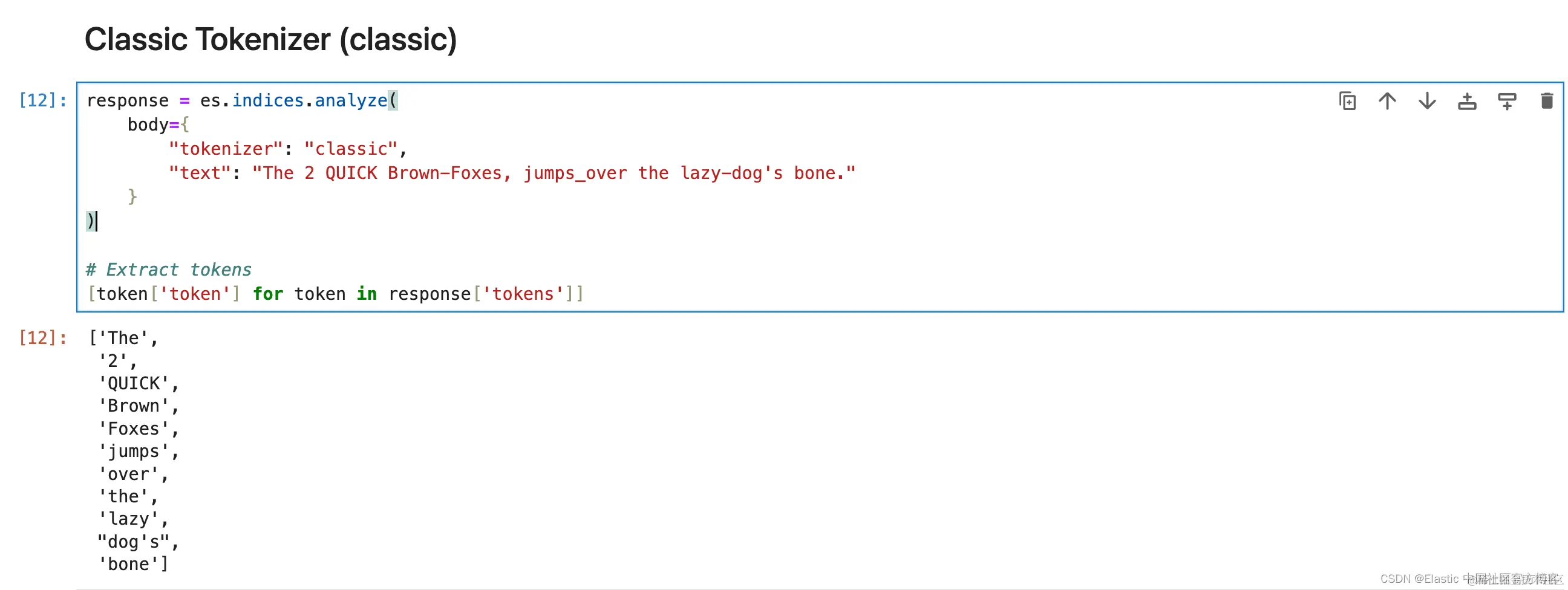 1. response = es.indices.analyze(