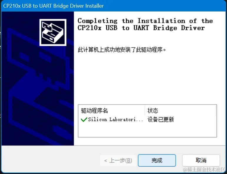 - 查看设备管理器,CP210x 设备已识别: