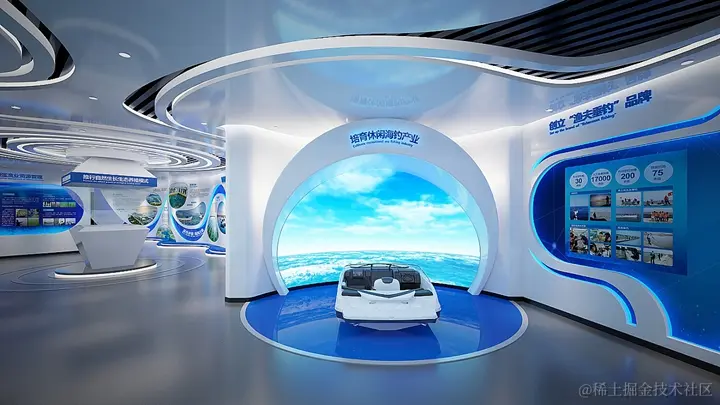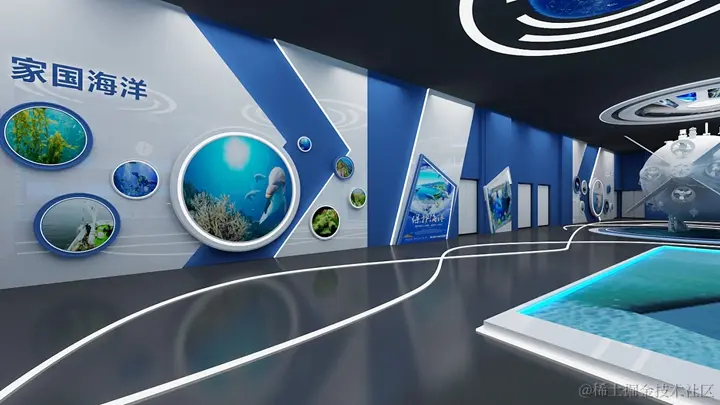 引入展厅展厅的入口处,巨大的水滴装置营造出仿佛踏入海洋的感觉。一道水幕门徐徐开启,犹如闯入一片神秘的水下世界。参观者步入展厅,立刻被深蓝色的墙面和令人陶醉的海洋音乐所环绕。展厅呈现出一种沉浸式的氛围,带领人们融入到海洋的神奇之中。