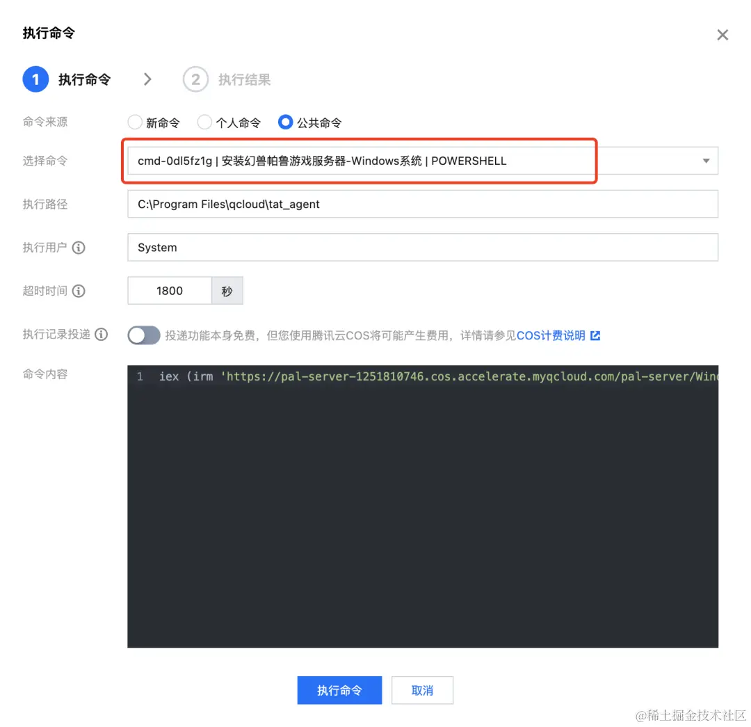 如果您需要在 Windows 服务器内一键部署幻兽帕鲁,那么需要选择命令“安装幻兽帕鲁游戏服务器-Windows系统”,选择后单击弹窗下方的【执行命令】按钮。