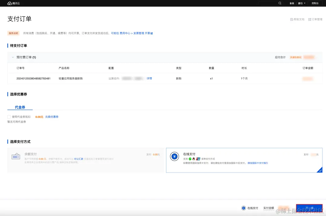 - 您可选择使用余额或在线支付。如您选择在线支付,则需要点击下一步。