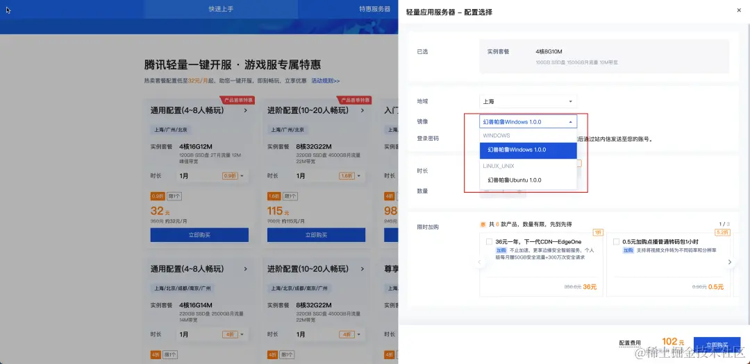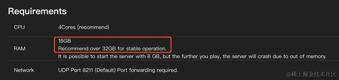 - 套餐规格:我们根据幻兽帕鲁官方的推荐配置,建议您选择CPU:4核,内存:16GB或以上的套餐配置。
