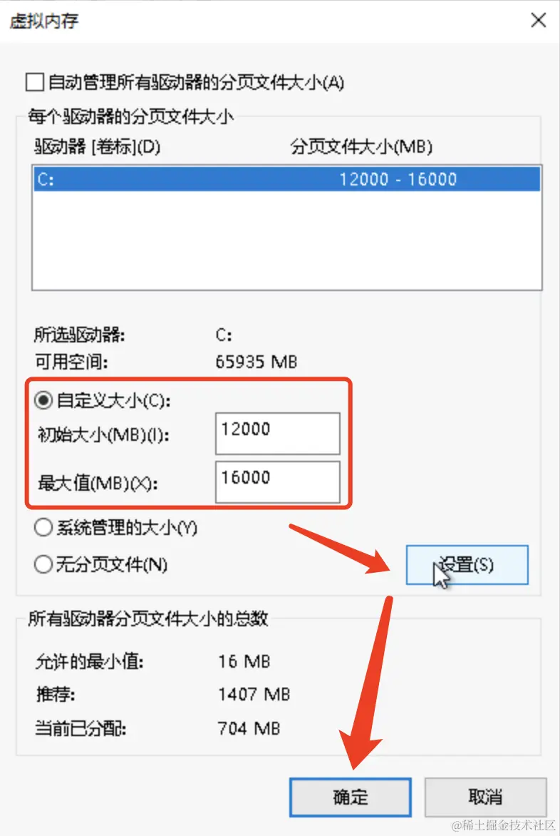 此处以8GB内存的服务器输入初始大小和最大值,再点击【设置】按钮后,单击【确定】。