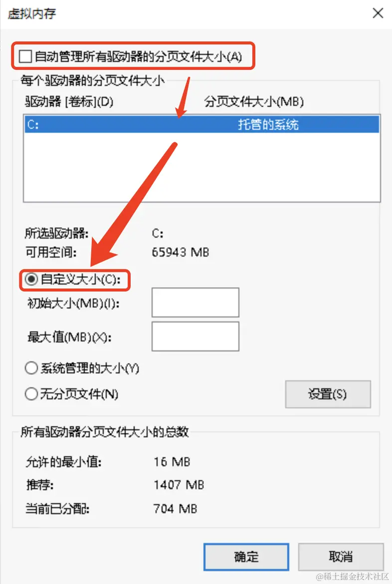 6、在虚拟内存窗口中,首先取消选中"自动管理所有驱动器的分页文件大小"的复选框。然后,选择服务器上的一个驱动器,并选择"自定义大小"选项。