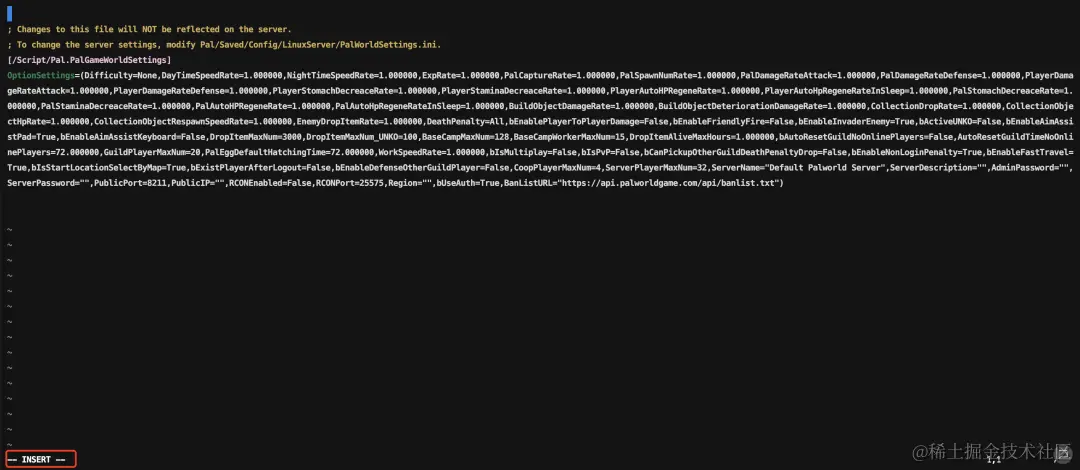 sudo vim /home/steam/Steam/steamapps/common/PalServer/Pal/Saved/Config/LinuxServer/PalWorldSettings.ini