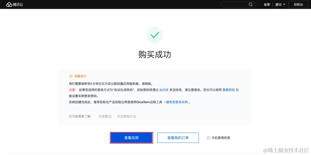 - 支付成功后,您将来到支付成功页,点击“查看实例”,即可前往轻量应用服务器控制台查看刚刚购买的服务器。