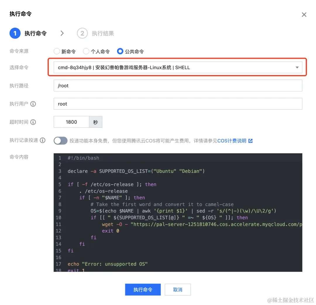如果您需要在 Linux 服务器内一键部署幻兽帕鲁,则需要选择命令“安装幻兽帕鲁游戏服务器-Linux系统”,并单击弹窗下方的【执行命令】按钮。