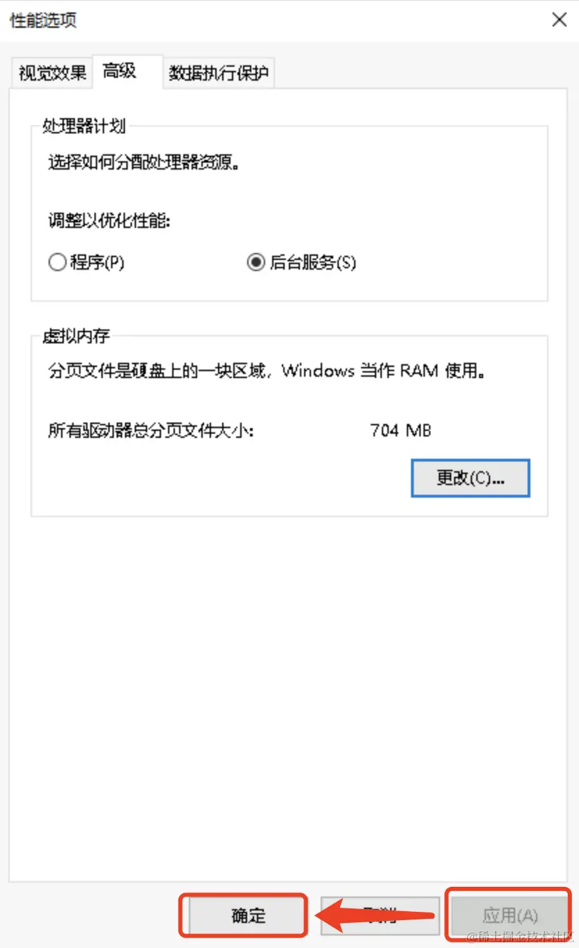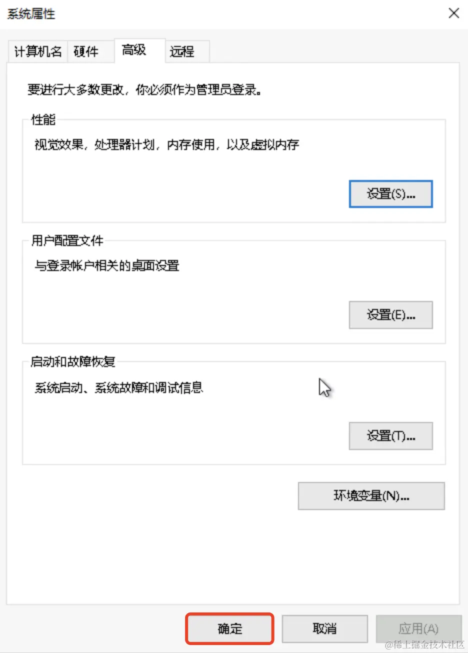 性能选项弹窗:先应用,再确定!系统属性弹窗:确定。