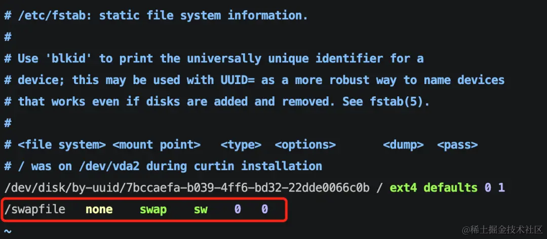 第六步:设置永久使用swap文件(系统在启动时自动启用swap文件)