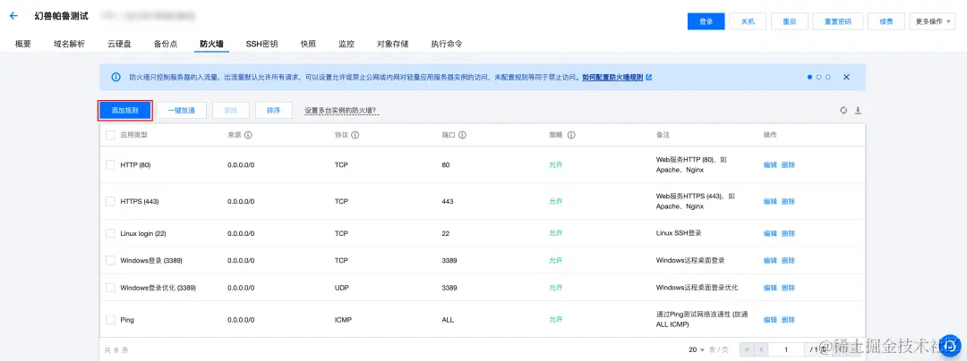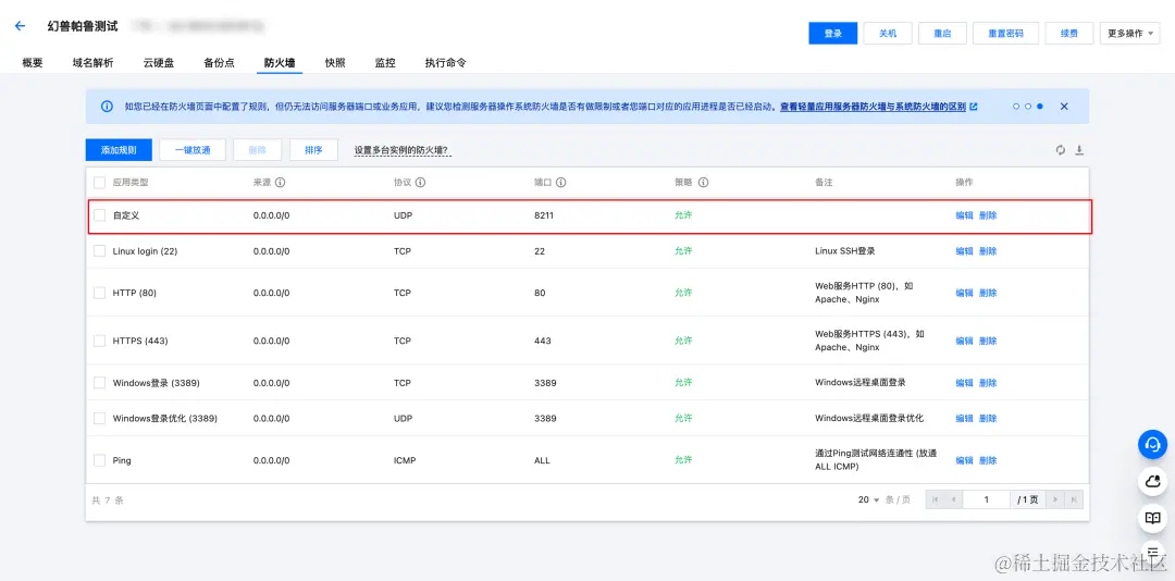 幻兽帕鲁默认使用8211端口进行通信,在登录之前您需要首先放通实例防火墙8211端口。