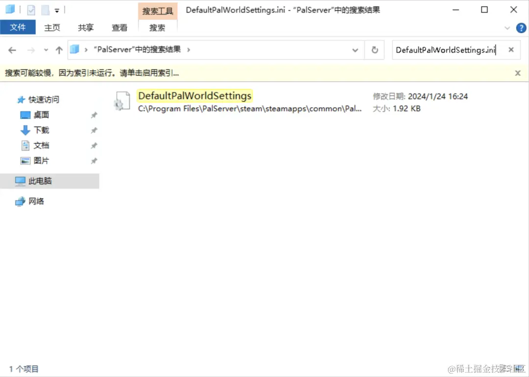 如您的幻兽帕鲁部署路径不为C:\Program Files\PalServer,推荐您直接使用文件名DefaultPalWorldSettings.ini,在Windows的文件夹内进行搜索。