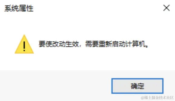 7、此时,系统会弹出如下对话框,提示:要使改动生效,需要重新启动计算机,单击确认即可。
