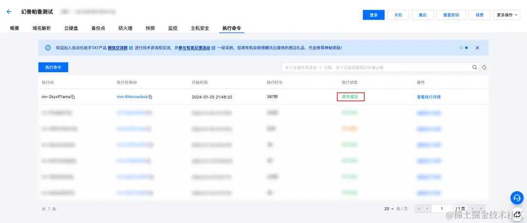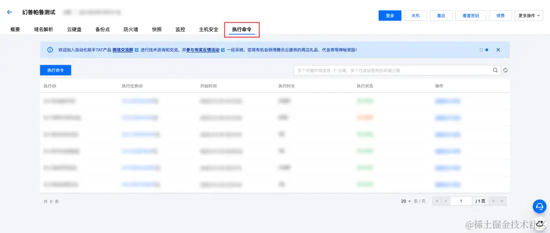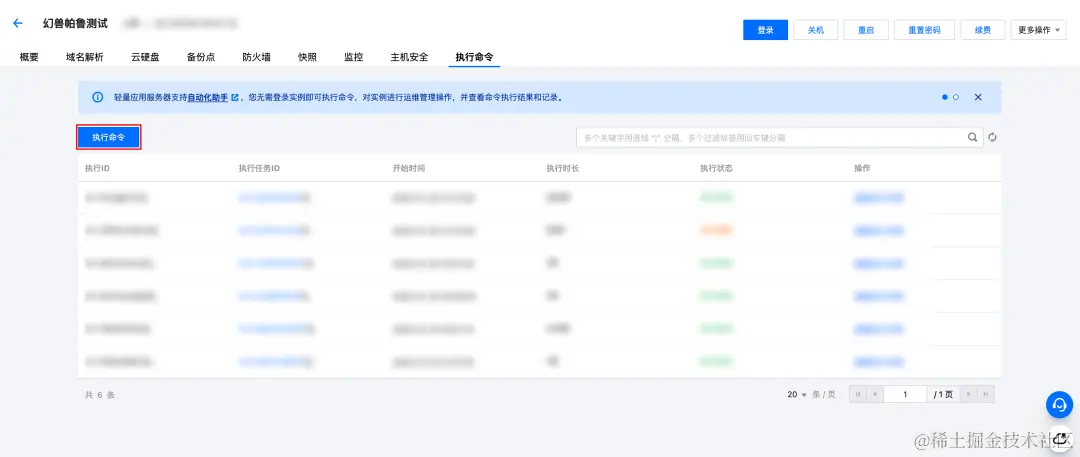 1、在轻量应用服务器控制台,选中对应服务器,单击进入实例详情页,找到【执行命令】页签,即可使用自动化助手的【执行命令】功能。