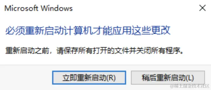 9、此时系统会弹出如下对话框,提醒“必须重新启动计算机才能应用这些更改”,建议您单击【立即重新启动】按钮。如不小心点击了稍后启动按钮,则手动重启Windows系统即可。