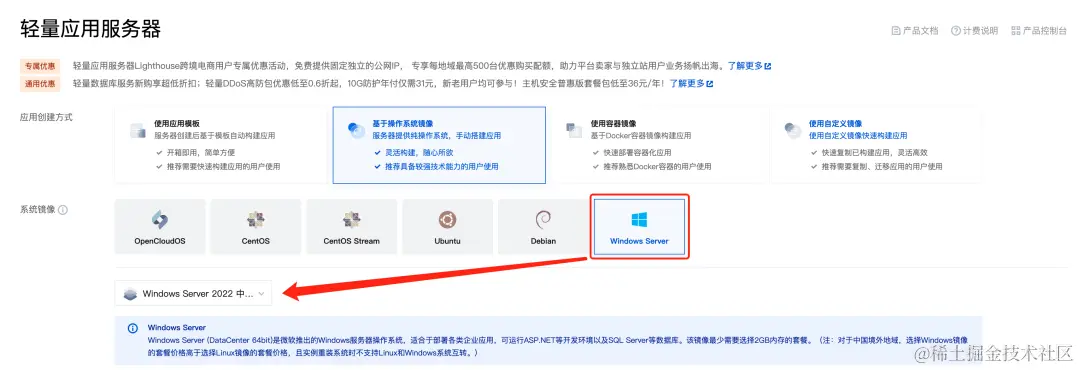选择Windows Server 2022镜像,后续您可以参考后文【方式一:极简一键部署】-【Windows服务器】进行部署。