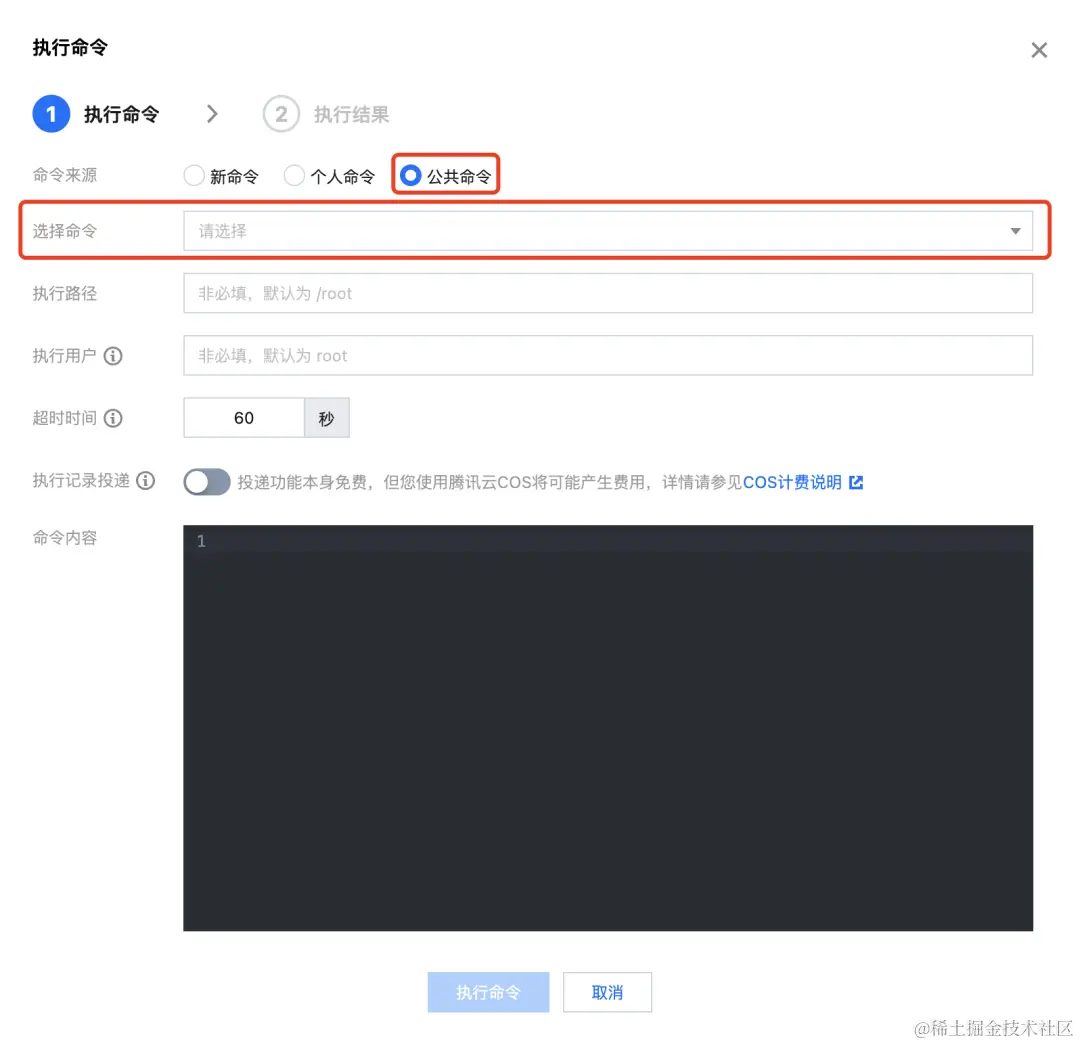 3、在执行命令的弹窗中,选择【公共命令】,并根据服务器操作系统的类型,下拉选择需要执行的命令。