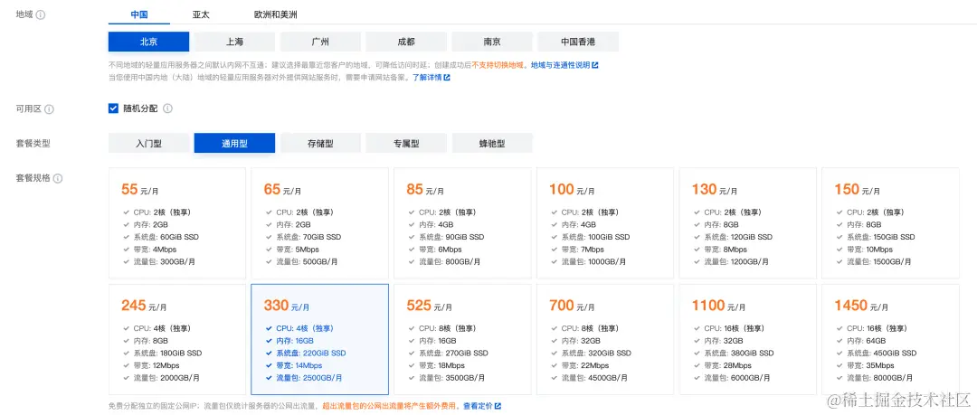 - 选择地域及套餐配置: