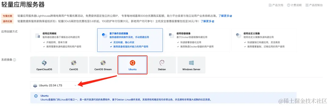 - 选择Ubuntu 22.04 LTS镜像,后续您可以参考后文【方式一:极简一键部署】-【Linux服务器】进行部署。