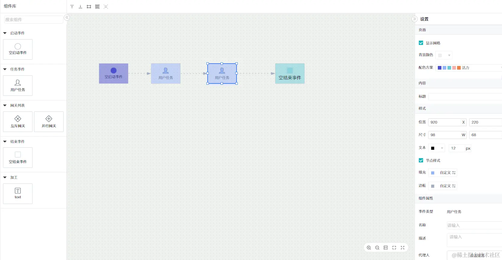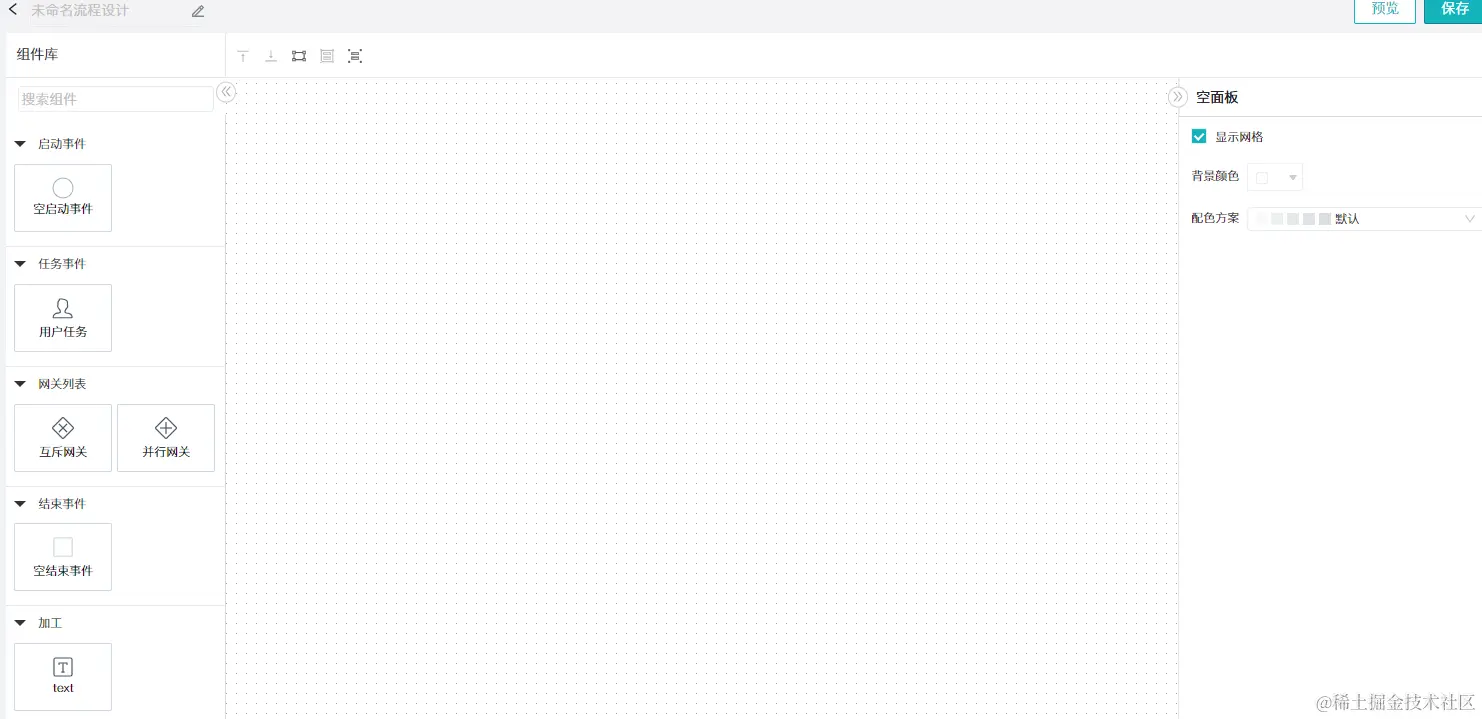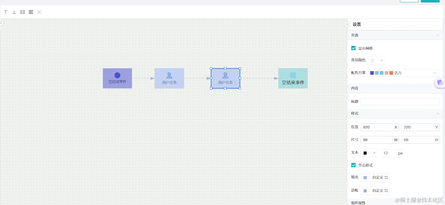 主画布FlowchartCanvas,主画布内置了一些常用的交互事件和默认配置,可通过config进行调整。使用通用流程图组件FlowchartNodePanel,除了内置的常用节点外,提供了便捷的自定义能力,可快速定制业务节点。