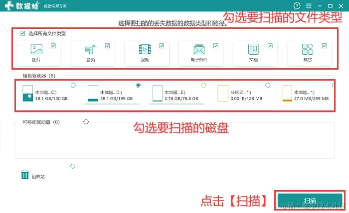 步骤2:在选择界面上,勾选上要扫描的文件类型(即误删除的内容类型),并勾选上要扫描的磁盘(若是外部设备,先与电脑连接后再选择),完成后,点击 【扫描】 ;