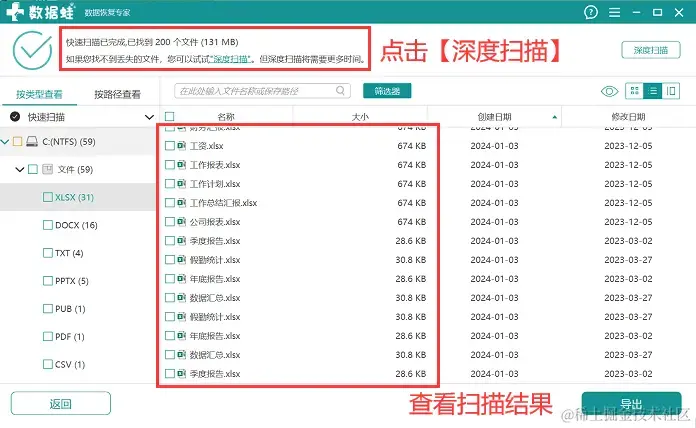 步骤4:等待深度扫描结束,此时软件会将有机会恢复的所有文件都呈现出来,建议用户在查看文件时借助【筛选器】 ,将所需恢复的文件类型和大小等条件输入,定位到文件后,将其勾选上,点击【导出】,并将导出后的文件保存在另一个磁盘。