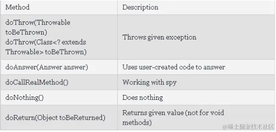 对Spy对象中方法的打桩建议用doXXX..when方式,因为when.. thenXXX方式会在实际打桩之前调用mock方法,而spy对象中方法在打桩之前的默认行为是调用真实对象的方法——触发了一次真实调用。