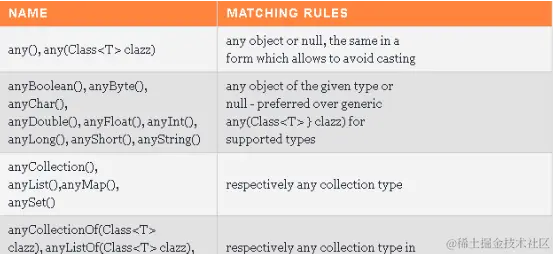 Mockito对匹配一组值提供了多种支持,如anyInt(), anyThat(), isA()等: