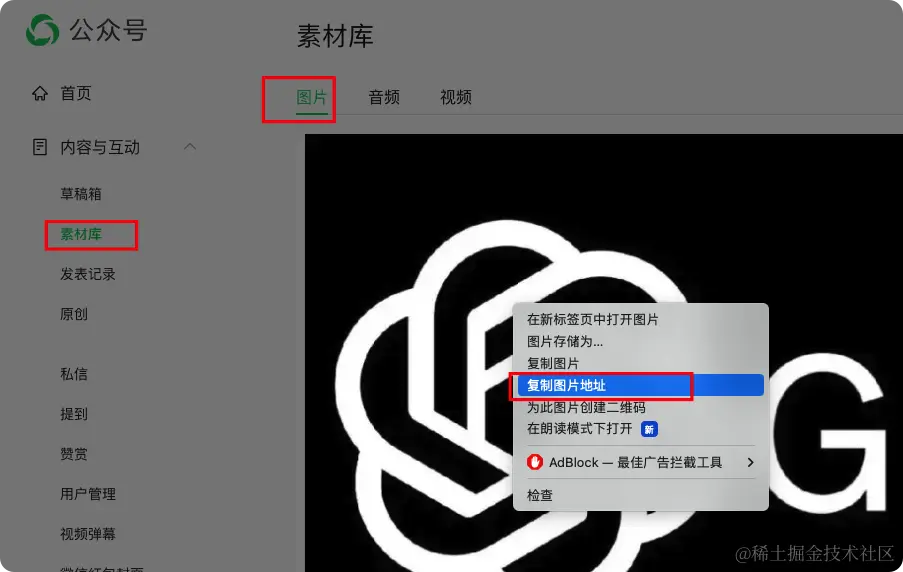在微信公众号后台你可以轻松获取图片地址:
