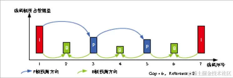 - B 帧(Bi-directional predicted frames):B 帧图像采用双向时间预测,可以大大提高压缩倍数。值得注意的是,由于 B 帧图像采用了未来帧作为参考,因此 MPEG-2 编码码流中图像帧的传输顺序和显示顺序是不同的。