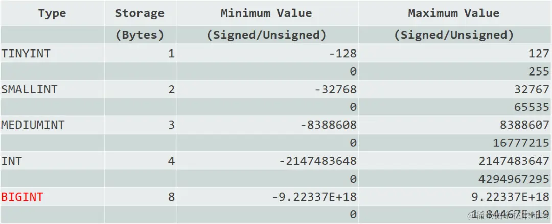 整型字段类型包含 tinyint、smallint、mediumint、int、bigint 五种,占用空间大小及存储范围如下图所示: