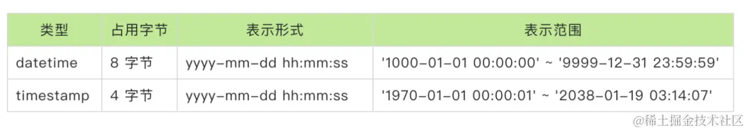 时间字段类型可以选用 datetime 和 timestamp,下面用一张表展示下二者的区别: