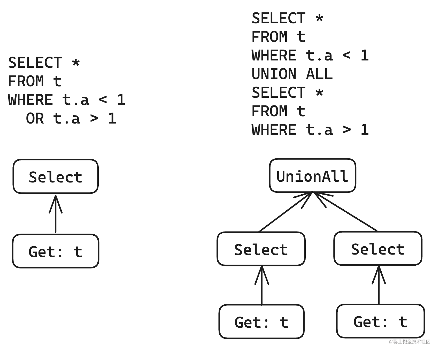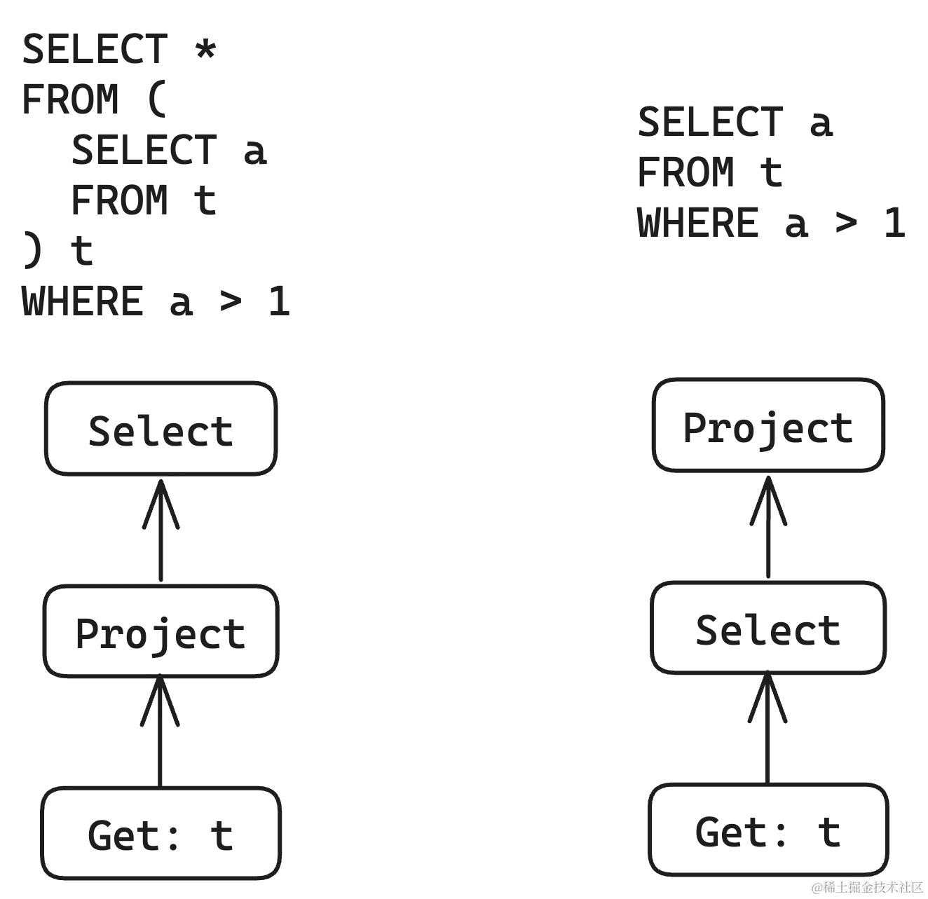 来到这里我们就面临了几个问题:按照关系代数的定理,Project 是不是可以作为 Select 的 child?Select 对于一条 SQL 查询来说是可选的,代码上该如何体现这点?