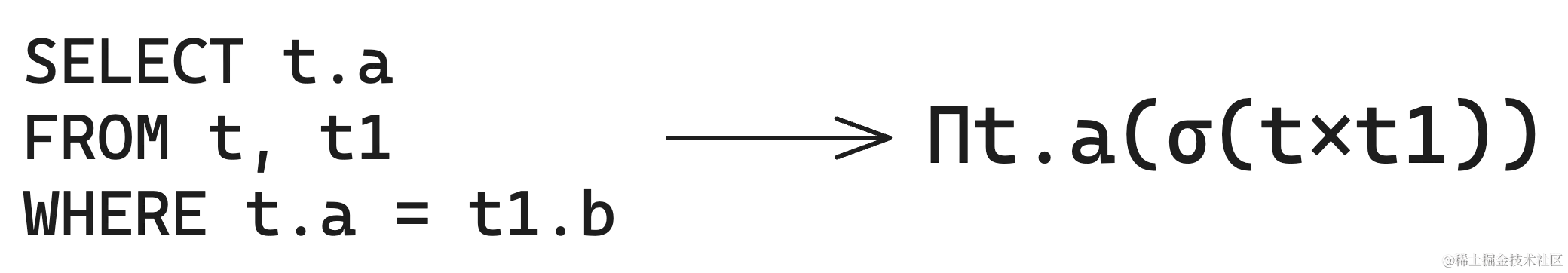 SQL 语言的理论基础是关系代数,每一条查询语句都有对应的关系代数表示,比如: