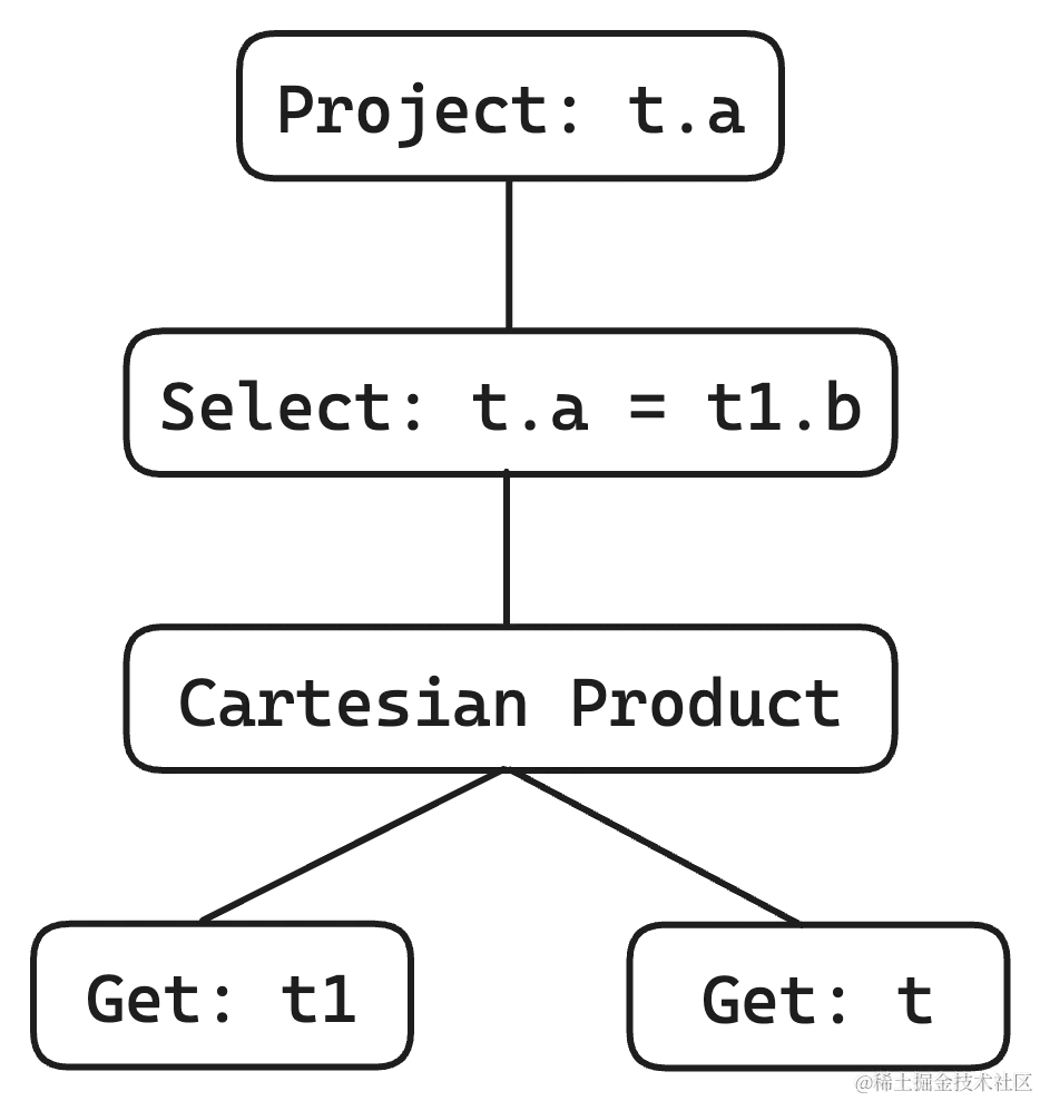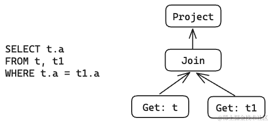 由于关系代数的表达式也是一个递归的树状结构,因此很多系统也很自然地将 SQL AST 转换成了类似下图的执行计划,我们将每个 node 称作算子 (Operator),将整个算子树成为查询计划 (Query plan)。
