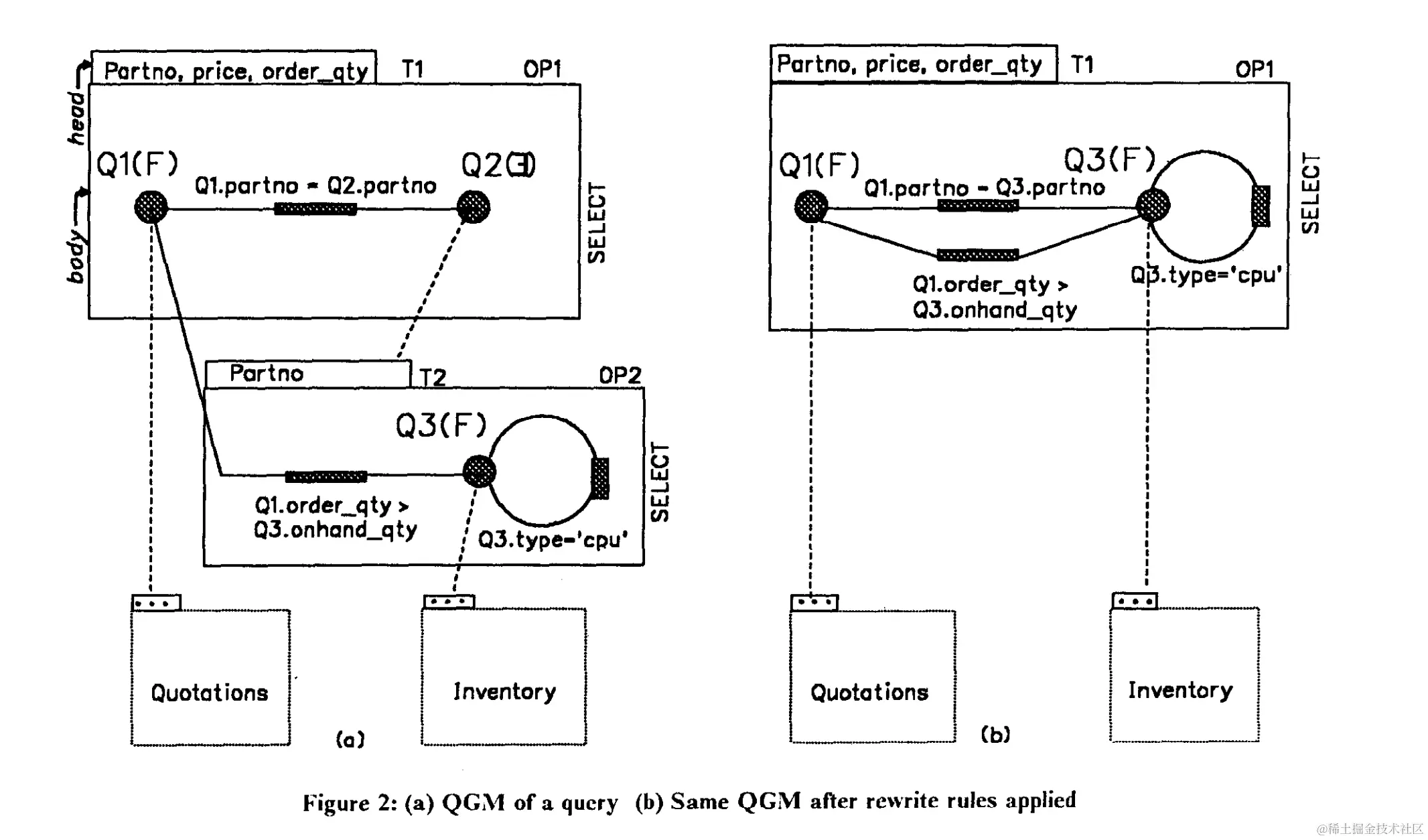 当然众多系统中也有异类,比如身为祖师爷的 IBM 在 Starburst 系统中引入了 Query Graph Model 这种表示方式。这种表示方式相当的抽象,将许多 property 给 hardcode 在了 QGM 中,导致理解起来异常困难,其宣称的可扩展性也令人怀疑。篇幅原因就不在这里展开讲解,有兴趣的话可以去阅读相关论文《Extensible Query Processing in Starburst》以及《Extensible/Rule Based Query Rewrite Optimization in Starburst》。