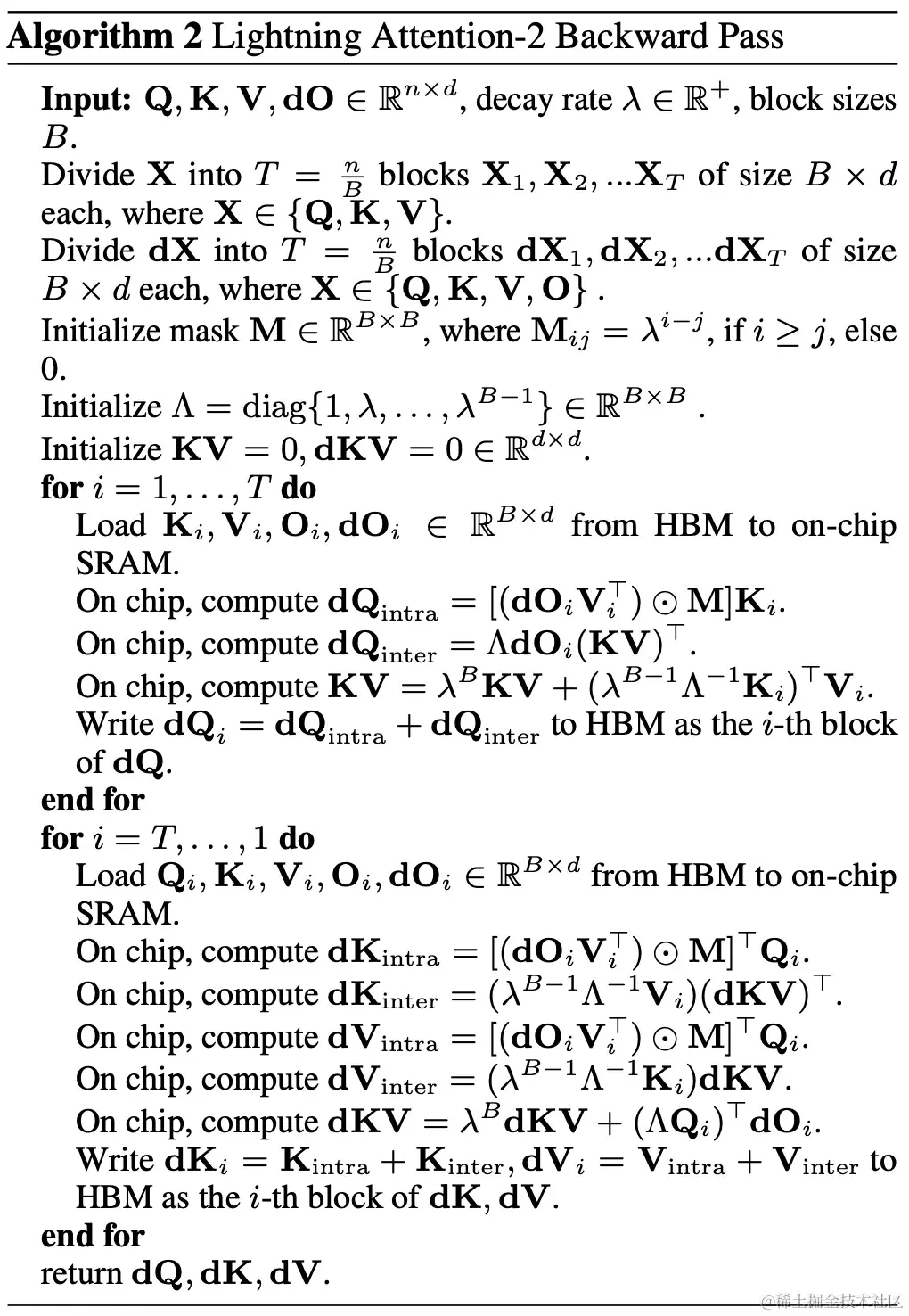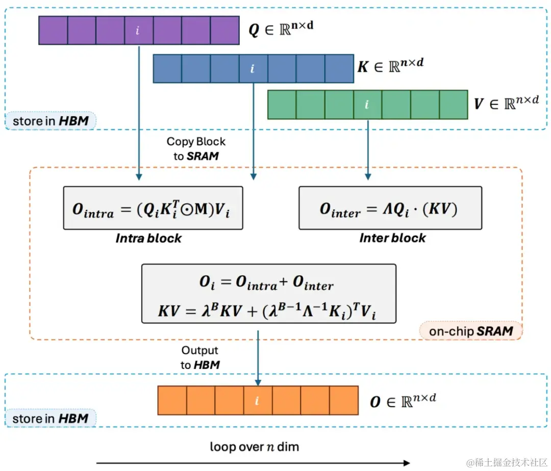 3. 细心的读者会发现,以上的过程只是 Lightning Attention-2 的算法部分,之所以取名 Lightning 是因为作者充分考虑了该算法过程在 GPU 硬件执行过程中的效率问题。受到 FlashAttention 系列工作的启发,实际在 GPU 上进行计算的时候,作者将切分后的 Q_i, K_i, V_i 张量从 GPU 内部速度更慢容量更大的 HBM 搬运到速度更快容量更小的 SRAM 上进行计算,从而减少大量的 memory IO 开销。当该 block 完成 Linear Attention 的计算之后,其输出结果 O_i 又会被搬回至 HBM。重复这个过程直到所有 block 被处理完毕即可。