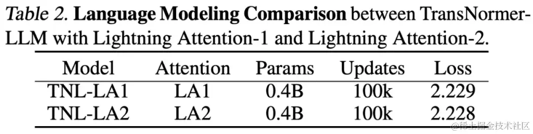 研究人员首先在小规模(400M)参数模型上对比了 Lightning Attention-2 与 Lightning Attention-1 的精度区别,如下图所示,二者几无差别。