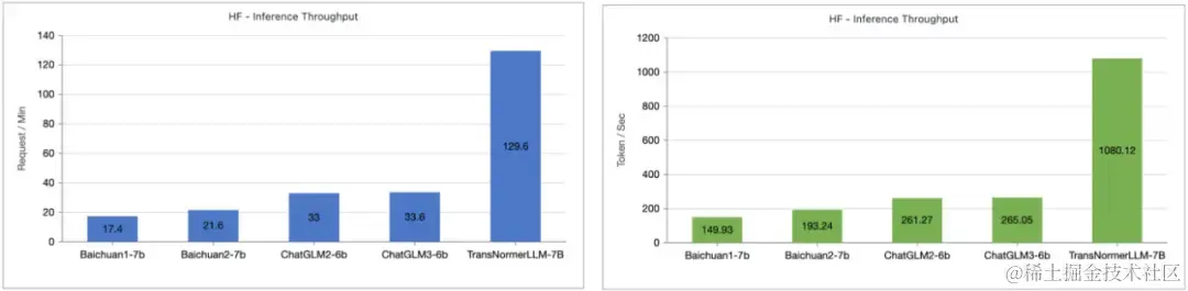 笔者测试了 Lightning Attention-1 加持的 TransNormerLLM-7B 与常见的 7B 模型在推理速度上的对比。如下图所示,在近似参数大小下,Lightning Attention-1 的吞吐速度是百川的 4 倍,ChatGLM 的 3.5 倍以上,显示出了优异的推理速度优势。