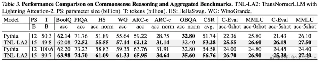 在大语言模型任务中,研究人员对比了 TNL-LA2 15B 与 Pythia 在类似大小下的大模型常见 Benchmark 的结果。如下表所示,在吃掉了相同 tokens 的条件下,TNL-LA2 在常识推理和多项选择综合能力上均略高于基于 Softmax 的注意力的 Pythia 模型。