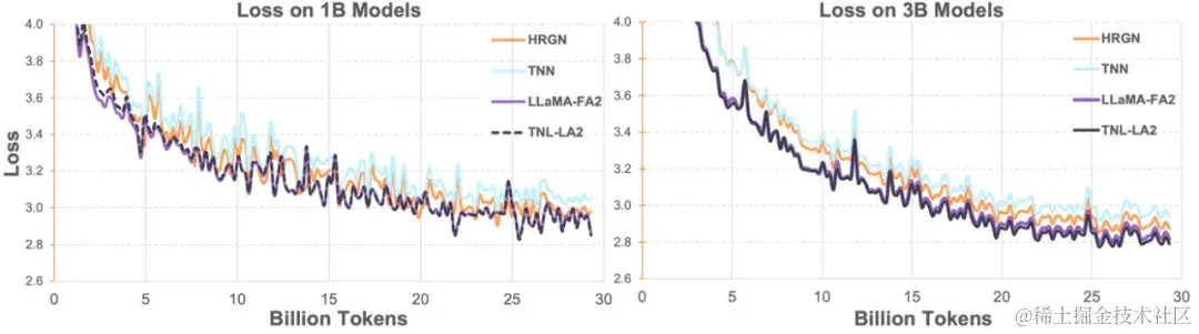 随后研究人员在 1B、3B 上将 Lightning Attention-2 加持的 TransNormerLLM(TNL-LA2)与其它先进的非 Transformer 架构的网络以及 FlashAttention2 加持的 LLaMA 在相同的语料下做了对比。如下图所示,TNL-LA2 与 LLaMA 保持了相似的趋势,并且 loss 的表现更优。这个实验表明,Lightning Attention-2 在语言建模方面有着不逊于最先进的 Transformer 架构的精度表现。