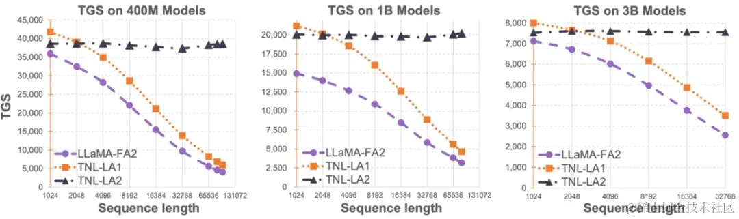 OpenNLPLab 团队尝试一劳永逸地解决大语言模型长序列问题。他们提出并开源了 Lightning Attention-2—— 一种新型的线性注意力机制,让长序列的训练和推理成本与 1K 序列长度的一致。在遇到显存瓶颈之前,无限地增大序列长度并不会对于模型训练速度产生负面影响。这让无限长度预训练成为了可能。同时,超长文本的推理成本也与 1K Tokens 的成本一致甚至更少,这将极大地减少当前大语言模型的推理成本。如下图所示,在 400M、1B、3B 的模型大小下,随着序列长度的增加,FlashAttention2 加持的 LLaMA 的训练速度开始快速下降,然而 Lightning Attention-2 加持的 TansNormerLLM 的速度几无变化。