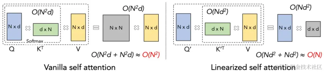 让大模型的预训练速度在不同序列长度下保持一致,这听起来是一个不可能的任务。事实上,如果一个注意力机制的计算复杂度相对于序列长度保持线性关系的话,就可以实现这一点。自 2020 年线性注意力【arxiv.org/abs/2006.16…】横空出世以来,研究人员一直在为了线性注意力的实际效率符合它的理论线性计算复杂度而努力。在 2023 年之前,大多数的关于线性注意力的工作均集中在对齐它们与 Transformer 的精度上。终于在 2023 年中期,改进的线性注意力机制【arxiv.org/abs/2307.14…】在精度上可以与最先进的 Transformer 架构对齐。然而,线性注意力中将计算复杂度变成线性的最关键的 “左乘变右乘” 的计算 Trick (如下图所示),在实际实现中远慢于直接左乘的算法。其原因在于右乘的实现需要用到包含大量循环操作的累积求和(cumsum),大量的 IO 操作使得右乘的效率远低于左乘。