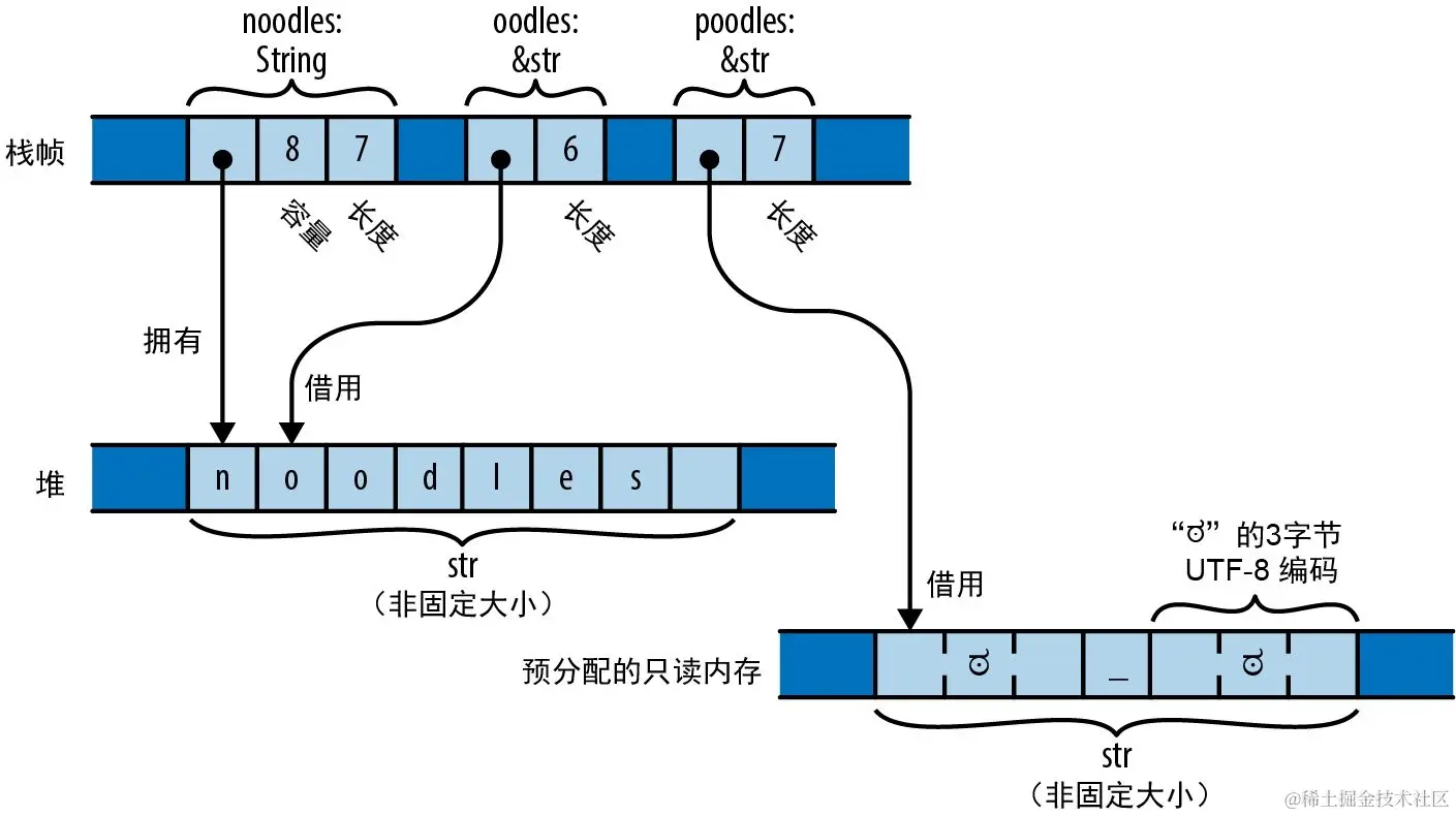 &str(发音为 /stɜːr/ 或 string slice)是对别人拥有的一系列 UTF-8 文本的引用,即它“借用”了这个文本。在示例中,oodles 是对 noodles 拥有的文本的最后 6 字节的一个 &str 引用,因此它表示文本“oodles”。与其他切片引用一样,&str 也是一个胖指针,包含实际数据的地址及其长度。可以认为 &str 就是 &[u8],但它能保证包含的是格式良好的 UTF-8。