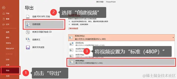 第2步:怎么压缩视频的大小?然后点击页面左上方的 【文件】 ,选择 【导出】 。在导出界面选择 【创建视频】 ,在右侧窗口将视频设置为 【标注(480P)】 可以有效降低视频的大小。