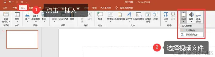 第1步:在电脑打开PPT,点击 【插入】 。在导航窗口点击 【视频】 中的 【此设备】 选项。
