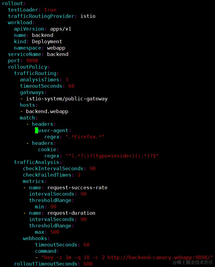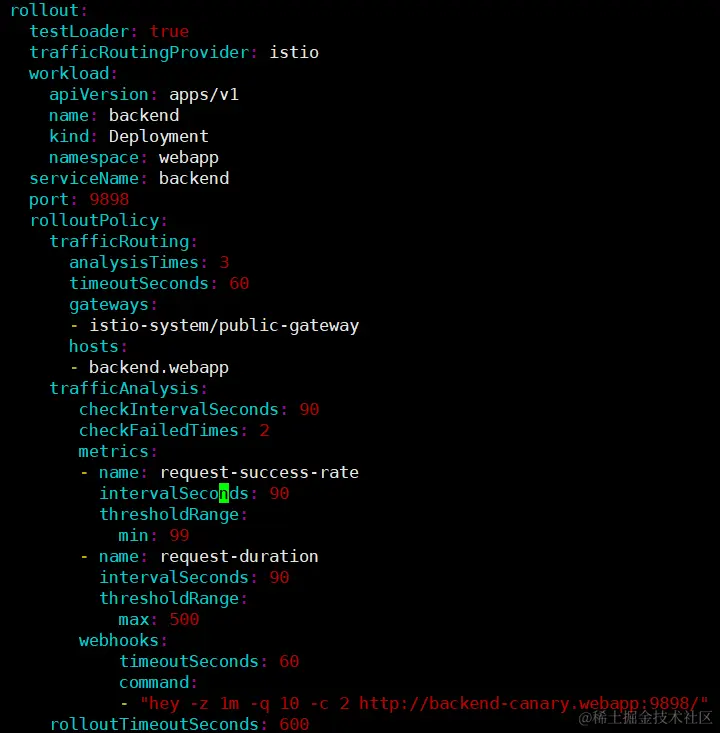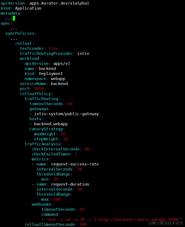 通过配置 rollout 中的 workload 字段,可以将金丝雀发布的目标设置为 webapp 命名空间下名为 backend 的应用。发布目标除了支持 deployment 应用之外,还支持 daemonSet应用。流量分析使用 Kurator 内置的请求成功率(request-sueccess-rate)和平均访问时延(request-duration)两个指标作为衡量新版本是否健康的标准。其中通过 thresholdRange 指定阈值。示例中要求请求成功率达99%,平均访问时延小于 500ms,新版本的服务才会被认定为健康。rolloutPolicy.canaryStrategy 配置了每次测试成功后,下次流量递增的比例和最终允许测试版本流量占比的最大值,从而实现渐进式发布新版本。示例中每次递增 10% 的流量流向新版本,最多为 50%。也可以设置 maxWeight 为 55,这样在最后一次测试的时候,只会新增 5% 的流量流向新版本。除了这些配置之外,Kurator 还可以设定完成验证之后,流量以什么样的比例逐步流向新版本。