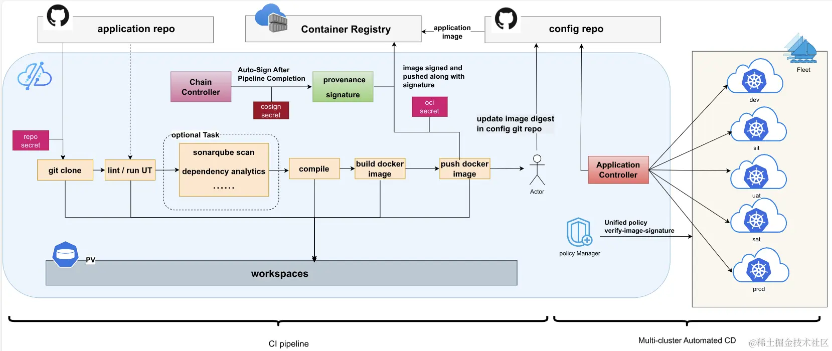 **在最新 0.6.0 版本中,Kurator 为云原生应用增加了 CI/CD 流水线设置与管理功能,简化流水线创建。此外,强化了 0.4.0 版本发布的统一应用分发功能,可以在部署新应用时设置金丝雀(灰度)发布、A/B 测试、蓝绿发布三种渐进式发布策略。**新增的流水线特性和渐进式发布功能与统一分发能力结合,实现基于代码仓库的 GitOps 工作流。这有助于快速构建分布式云原生平台,简化应用开发与发布流程。Kurator CI/CD 的结构图如下所示: