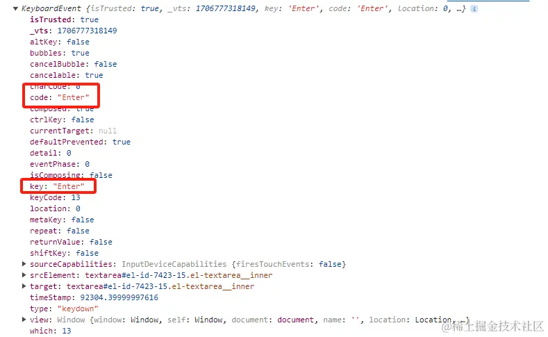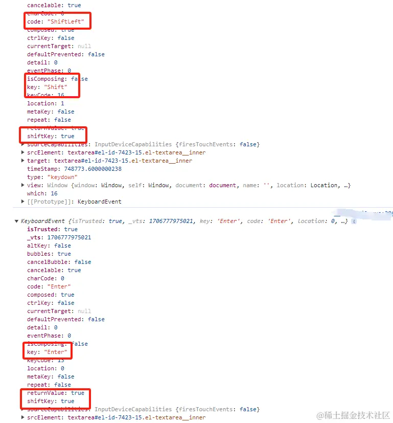 仍然是回车时间返回的参数,当我同时按下shift+回车,返回以下内容,会返回两个键的信息,一个是shift键,一个是enter键的信息,我们看enter键的信息也就是第二个,注意shiftKey