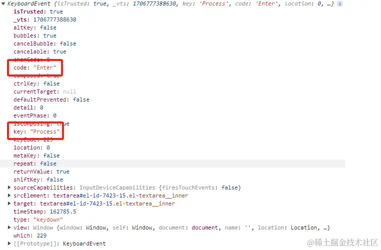 之前的方案在苹果电脑自带的输入法里会有问题,打字过程回车仍会触发事件,这是我们不想要的。苹果在输入法回车时,key并不是process